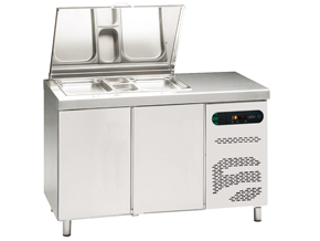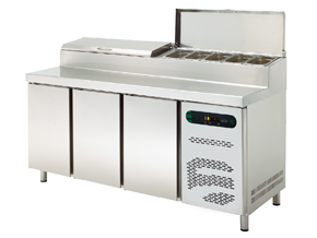 Стол холодильный трехдверный, в столешницу встроен отдел под гастроемксти GN(размеры можно комбинировать) с крышкой (гастроемкостями не комплектуется) со своим охлаждением, объемом 214л., температурный режим работы -2/+8 °С, интуитивное цифровое управление, автоматическая разморозка, бесконтактный конденсатор со специальной конструкцией, предотвращающий образование пыли и грязи, что позволяет избежать операций очистки и снижения потребления энергии, боковое расположение агрегата. Вытяжной испаритель с антикоррозийным покрытием. Климат класс +43°С(при открытых гастремкостях он понижается), в комплекте 1 пластифицированные полки на каждую дверь, исполнение - нерж. сталь